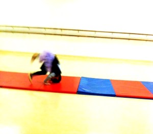 C.J.’s Dad and I took turns watching C.J.’s Brother practice parkour in the main gym downstairs. We were afraid to leave C.J. upstairs alone by himself and afraid of what the other parents might gossip about when we weren’t around. We know we shouldn’t care, but we do. We’re working on it.